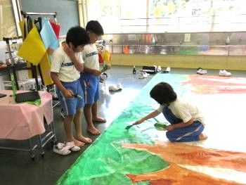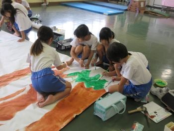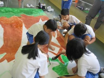 3年生は、2階のワークスペースで、学習発表会のステージで使用する背景画を製作していました。二上山の木々をみんなで協力しながら色を塗りました。舞台で使用するものを自分たちでつくっている3年生。ステージ発表への思いも高まってきました。