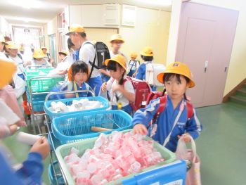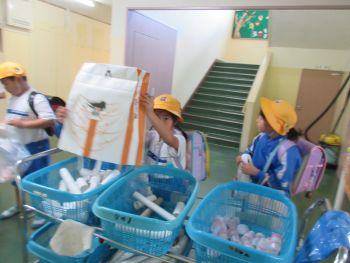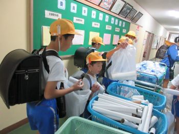 登校した万葉っ子は、夏の間に集めたペットボトルのキャップや空き容器等、かごにたくさんの材料を分別して入れました。