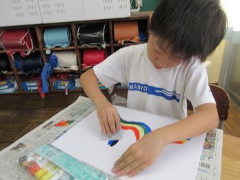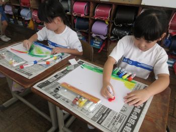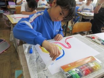 2年生が、図画工作科の時間に「ヒッパレインボー」の学習を行いました。画用紙に絵の具をのせて、厚紙で引っ張ると…色が混ざり合い、思いがけない美しい模様が現れました。