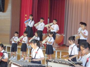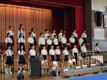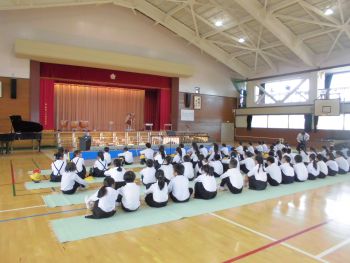 万葉小学校の子供たちは、学習発表会で披露した合唱や合奏を成美小学校の5年生に向けて発表しました。また成美小学校の5年生による演奏も鑑賞し、お互いの音楽を通して交流を深めました。
