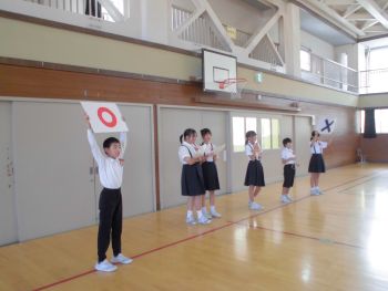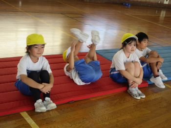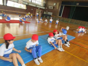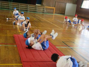 2年生が、体育の時間にマットを使った運動遊びを行いました。今回はゆりかごやカエルの足うち等を行いました。ゆりかごでは、背中を丸めて前後に揺れることで「ゆれる」「回る」等の感覚を身に付けます。子供たちは、マットの上で楽しみながら体を動かしていました。
