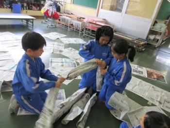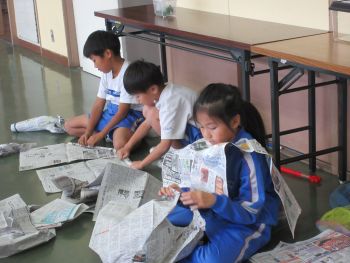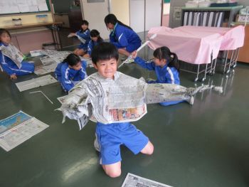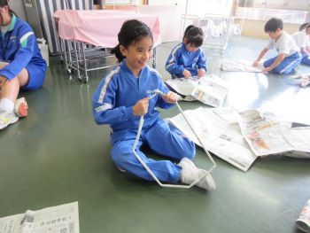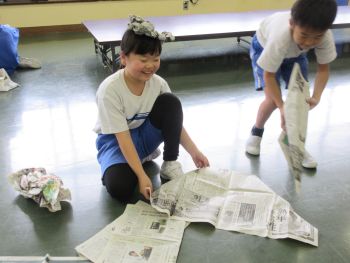 2年生は図画工作科の時間に、「どんどんかわるよ 新聞紙」の学習に取り組みました。新聞紙を使って、穴をあけたり、丸めたり、破ったり、ねじったりと思いつくままに新聞紙の変化を楽しみました。