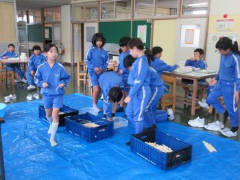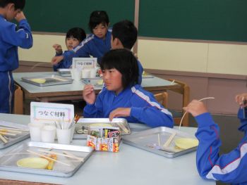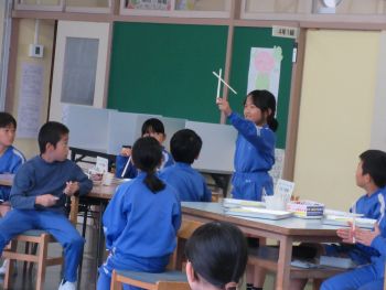 4年生は図画工作科の時間に、「直線と曲線から生まれる形」の学習に取り組みました。割り箸や籐を使い、材料の香りを楽しみながら活動を進めました。
