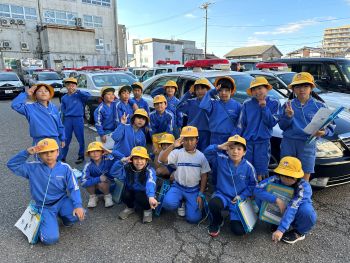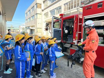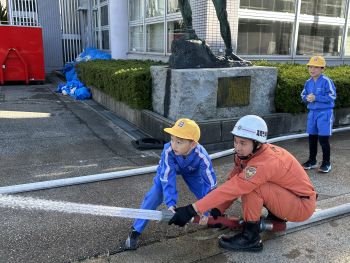 3年生が、高岡警察署と高岡消防署へ校外学習に出かけました。高岡消防署では、通信指令室の様子を見学し、実際使用している車両を見たり、放水体験をしたりしました。