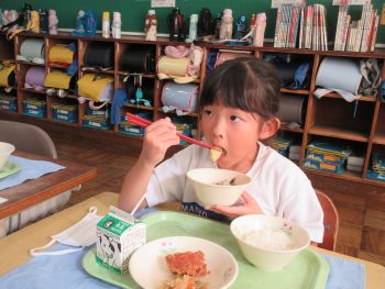 1年生が収穫したサツマイモを使った「さつま汁」が給食に登場しました。
