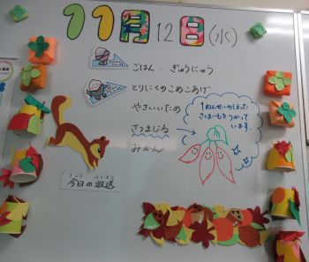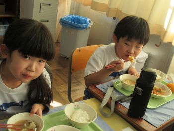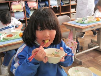 1年生が収穫したサツマイモを使った「さつま汁」が給食に登場しました。