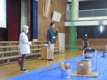 子供たちは動画で米作りについて学んだあと、実際にもちつきの体験をしました。初めて杵を持った子供も多く、みんな笑顔いっぱいで楽しんでいました。