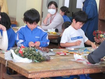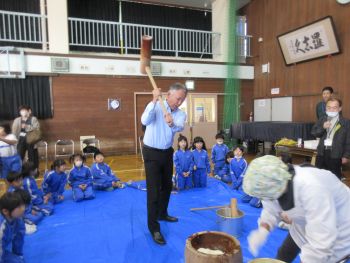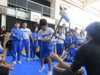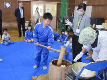 子供たちは動画で米作りについて学んだあと、実際にもちつきの体験をしました。初めて杵を持った子供も多く、みんな笑顔いっぱいで楽しんでいました。
