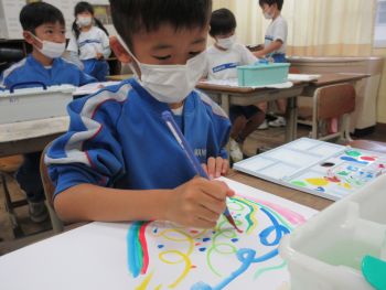 1年生が図画工作科の時間に、「クラッカーが飛び出す様子」に挑戦しました。細い線や太い線、短い線等、様々な線を使って表現。友達の作品が紹介されると、「わあ、すごい!」と素直な感想をつぶやく姿も見られました。カラフルで楽しい作品がたくさん仕上がりました。