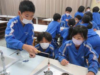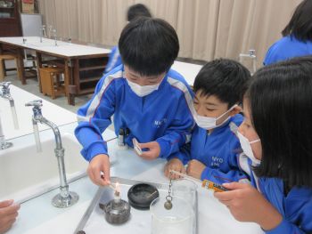 4年生は理科の時間に、金属の体積が温度によってどのように変化するかを調べる実験を行いました。昨日学習したアルコールランプの使い方はバッチリ。温めた後の金属は体積が大きくなり、子供たちはその結果にとても驚いていました。