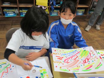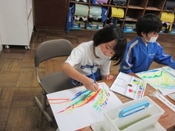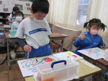 1年生が図画工作科の時間に、「クラッカーが飛び出す様子」に挑戦しました。細い線や太い線、短い線等、様々な線を使って表現。友達の作品が紹介されると、「わあ、すごい!」と素直な感想をつぶやく姿も見られました。カラフルで楽しい作品がたくさん仕上がりました。