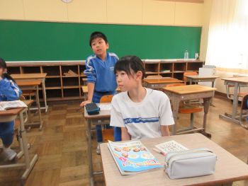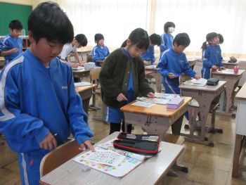3年生は外国語活動の時間にアルファベットの学習をしました。英語専科の先生がアルファベットを一つずつ読み上げると、子供たちはビンゴカードに印を付けていきます。リーチになると、嬉しそうに立ち上がり、ビンゴまであと少しであることを知らせました。