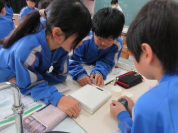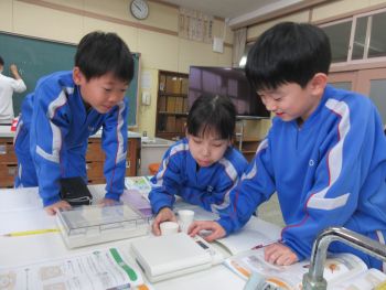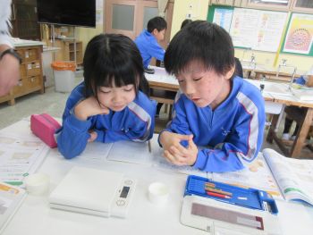3年生は、理科の時間に同じ体積の塩と砂糖の重さを調べる実験をしました。自分なりの予想を立ててから、計測をしました。新たな発見はできたかな。