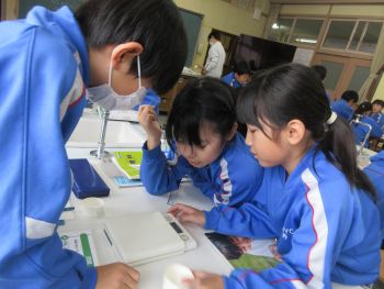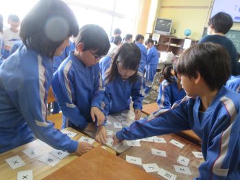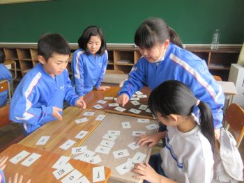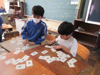 4年生は、外国語活動の時間にアルファベットの小文字に親しむためのゲームに挑戦しました。アルファベットカードを使って、指定された10個の単語づくりにチャレンジ。グループの仲間と分担し、助け合いながら、夢中になって活動していました。