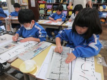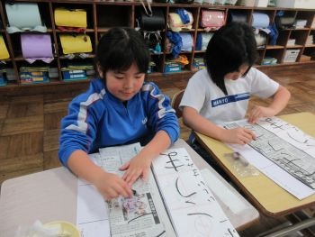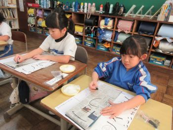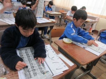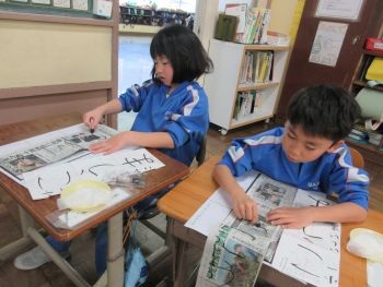 1年生が書初練習を行いました。今年は「こうま」と書きます。苦手な文字を何度も練習する子、力強く書こうと心を込める子、大きさに気を付けながら書く子。真剣な表情で手が真っ黒になるまで練習していました。