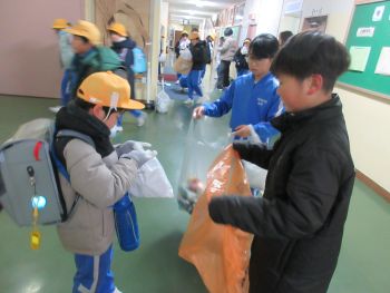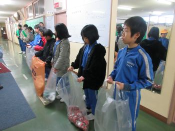 4年生が12月に各教室を回って説明したアルミ缶回収を本日実施しました。袋を手にして登校してきた人を見つけると4年生の表情がぱっと明るくなりました。「ご協力ありがとうございます」「いらない袋はこちらに捨ててください」あちらこちらから聞こえてきました。つぶされていない缶の処理もみんなで力を合わせて行いました。