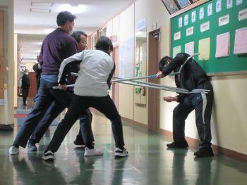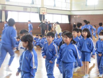 今日は、児童玄関から不審者が侵入したという想定で、避難訓練を行いました。教職員は連携して対応の動きを確認し、児童は机を動かしてバリケードをつくったり、静かに身を潜めたりしました。