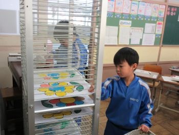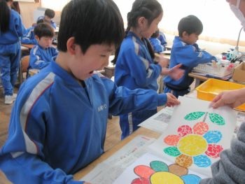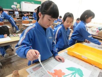 1年生が、図画工作科の時間にシール版画を製作しました。紙を水で湿らせてから、版の上に重ね、バレンで擦りました。きれいに写し取れてとても嬉しそうな1年生でした。