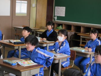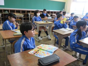 外国語活動中の3年生。今日は、circle(円) square(正方形)等、身近な形の言い方を教わり、英語専科の先生の言い方をよく聞きながら発音の練習を行いました。