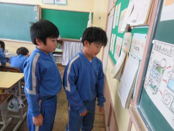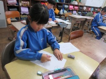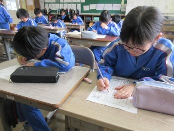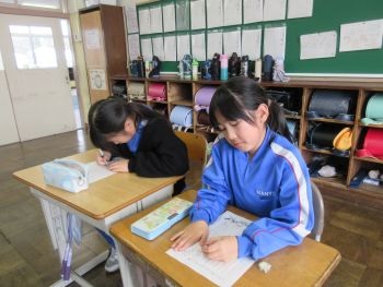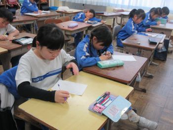 3年生は動画を見たあと、調理員さんへ感謝の気持ちを込めて手紙を書きました。「この前食べたおいしかった献立の名前は何だっけ」と献立表と確認したり、「僕のことを考えて作ってくれてうれしい」と思いを言葉にしたりと、改めて給食について考えることができたようです。