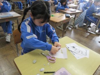 2年生は、明日の万葉タイムに向けて準備を進めていました。動物の絵が描かれたカードに、ハサミで丸い穴を開ける作業に集中して取り組んでいました。どんな活動になるのか楽しみですね。