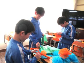 今週末に卒業を祝う会を控え、5年生が急ピッチで準備を行っていました。飾りをつくったり、プログラムを書いたりとそれぞれが役割を分担しながら和気あいあいと楽しそうに作業を進めていました。