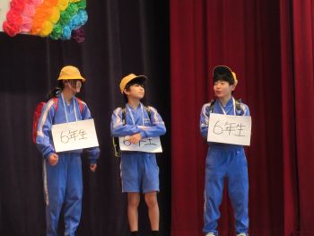 続いて5年生の出し物。1年生の頃の写真が映し出されると、6年生は懐かしそうに見入っていました。その後の劇やクイズでは、会場が笑いと温かな雰囲気に包まれました。