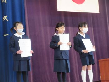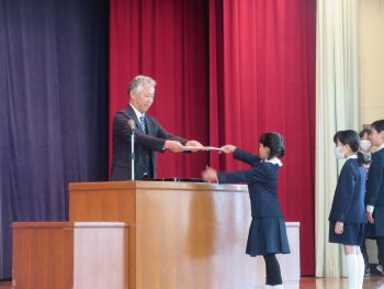 令和7年度第3学期終業式・修了式を行いました。式のはじめには、各学年の代表児童が校長先生から修了証を受け取りました。