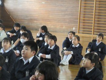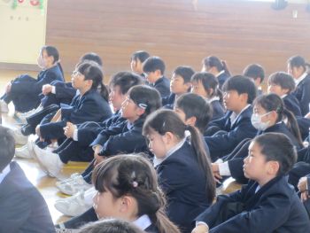 続いて、校長先生からは、この1年間を支えてくれた家族や友達、地域の方々へ「ありがとう」を伝える1日にしてほしいこと、そして4月によいスタートが切れるよう春休みの間にしっかり準備をしてほしいことについてお話がありました。子供たちは真剣に耳を傾けている様子でした。